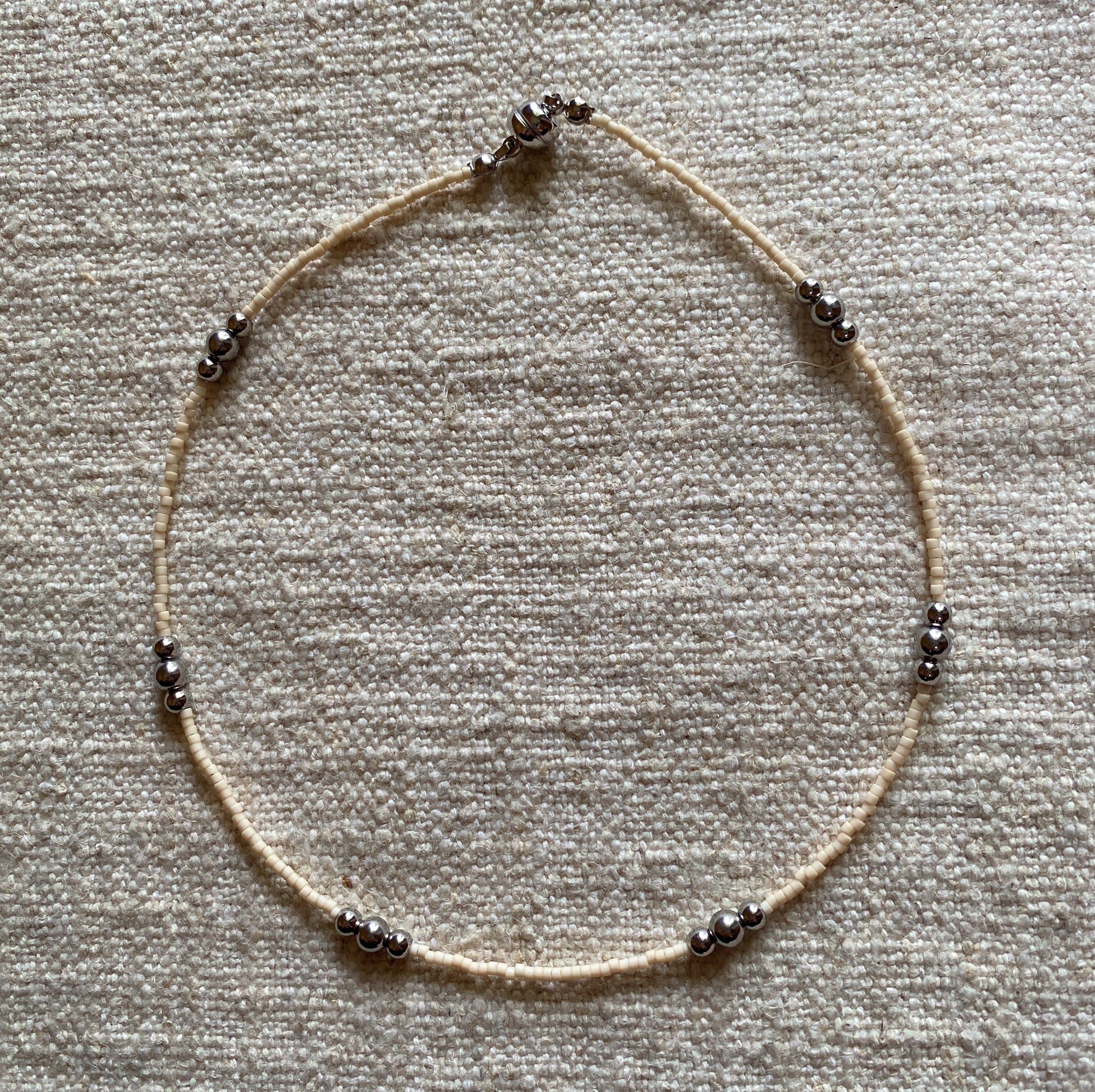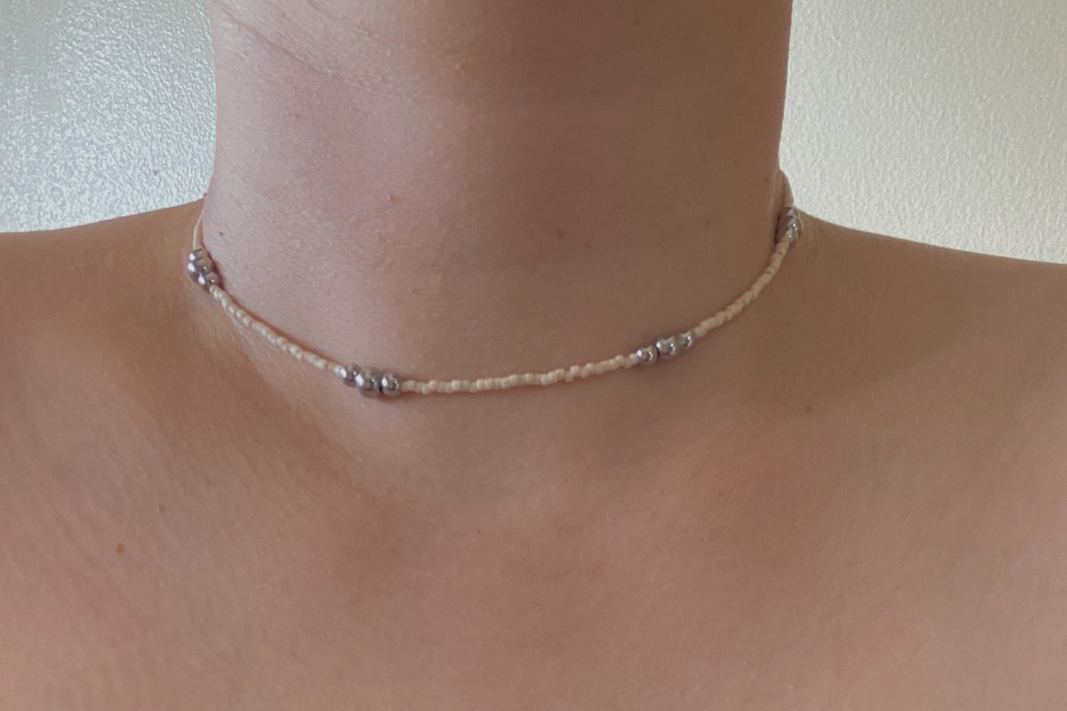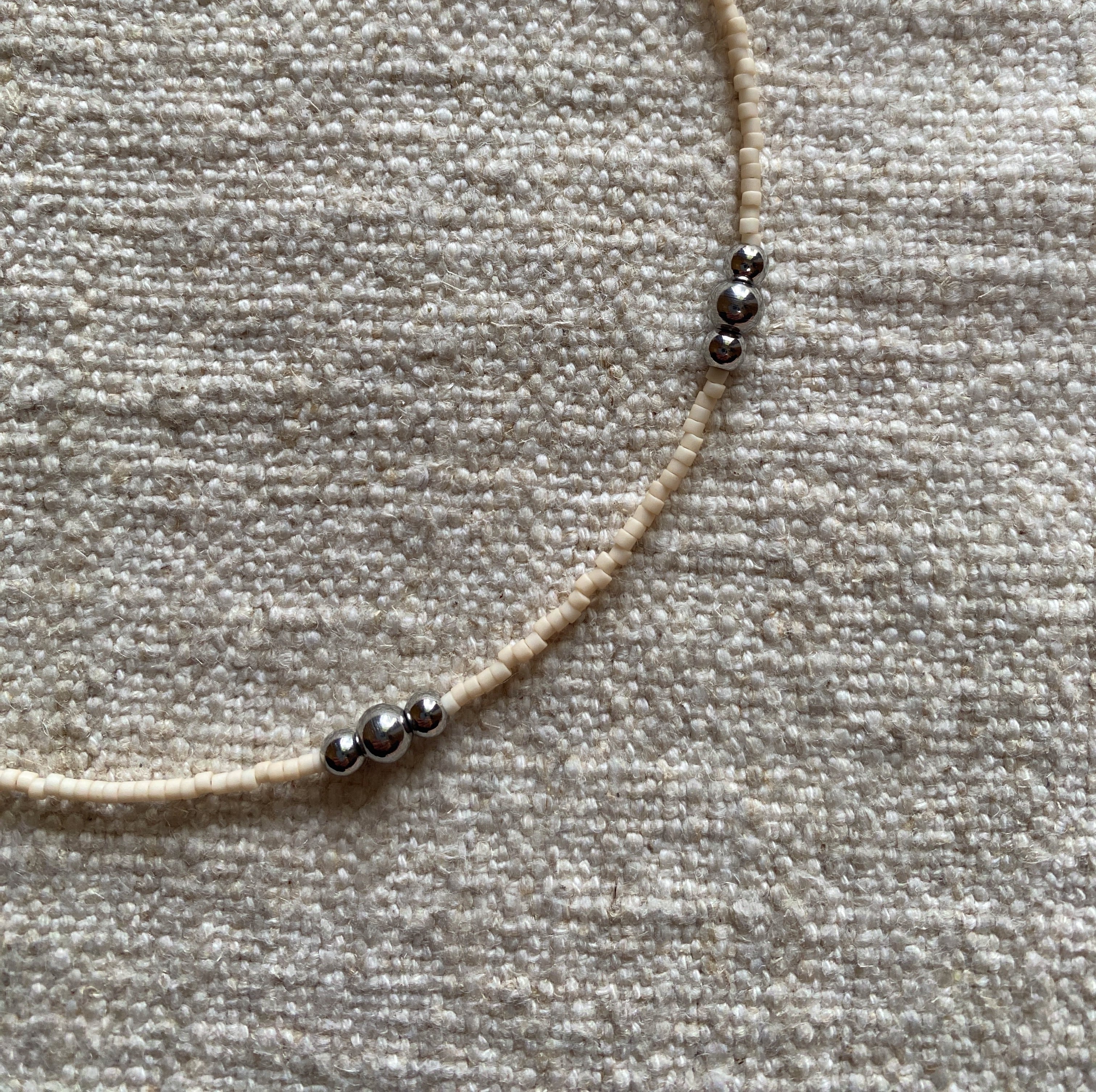細いシルバービーズに2つの大きさの玉をバランスよく3つ並べてみました