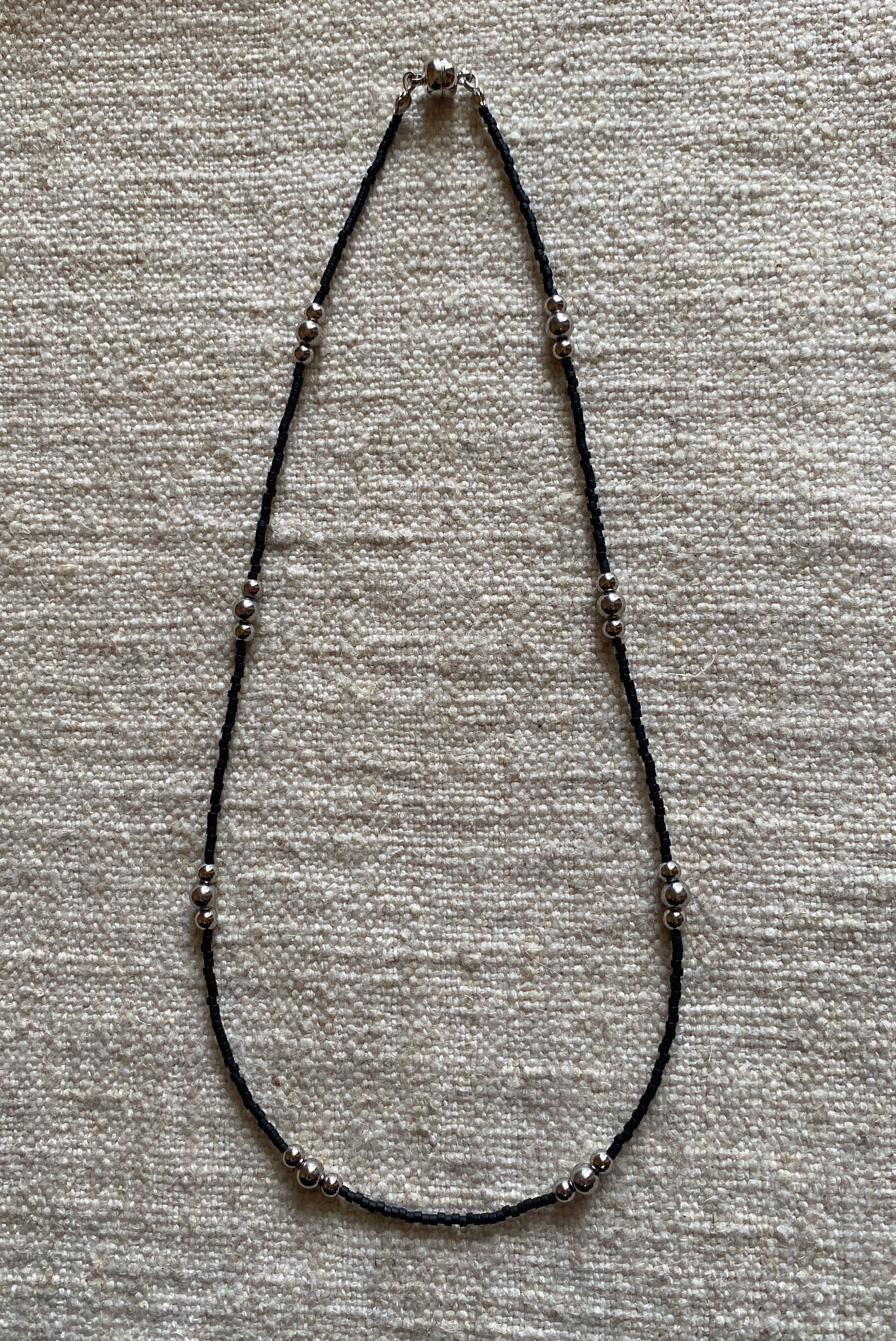 細いシルバービーズに2つの大きさの玉をバランスよく3つ並べてみました